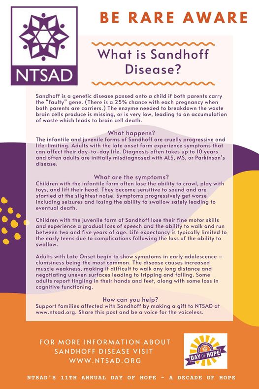 - I just donated $20 to NTSAD. NTSAD leads the worldwide fight to treat and cure Tay-Sachs, Canavan, GM1, and Sandhoff diseases by driving research, forging collaboration, and fostering community. NTSAD’s Day of Hope’s goal is to raise $50,000 to support research, so we can find treatments for these diseases! Will you match my gift by giving $20 now? https://bit.ly/3zZNho6 or add your personalize Day of Hope Page link